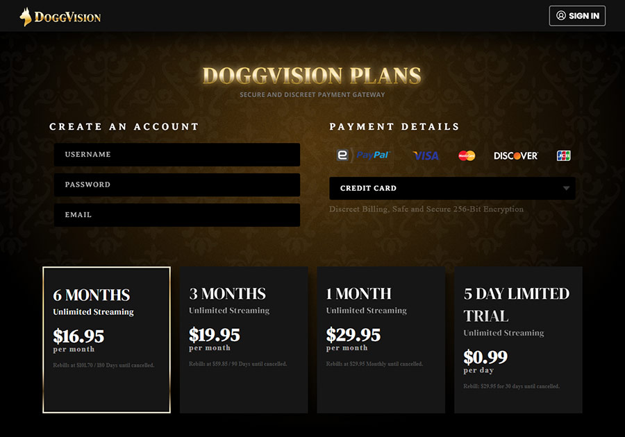 DoggVision throws out membership deals that don’t exactly break the bank. You can dip your toes in the muck for $4.95 for a quick 5-day pass, or commit to a full month for $29.95. Longer plans go for: